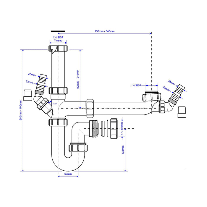 McAlpine 1.5" Bowl and a half Sink Kit - 2 Nozzle (75mm Water Trap) - SK1A