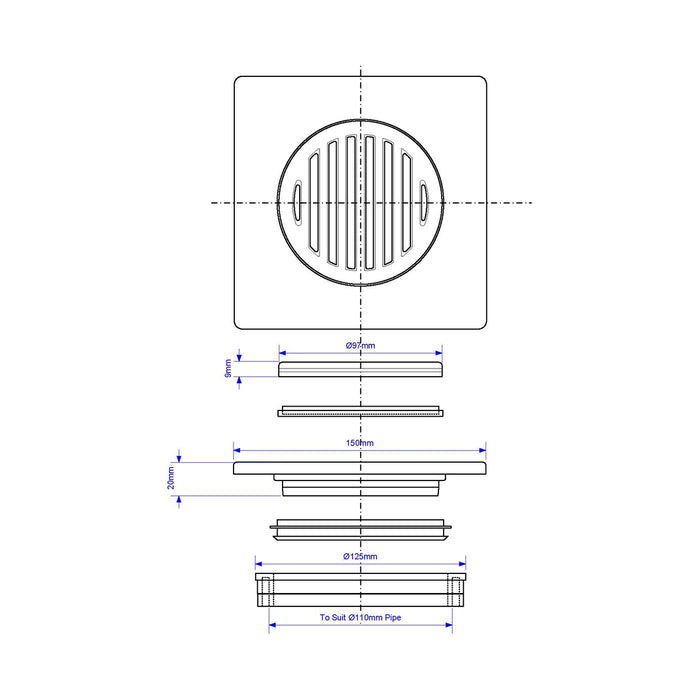 150mm Square Polished Stainless Steel Tile with removable grid and ABS Adaptor