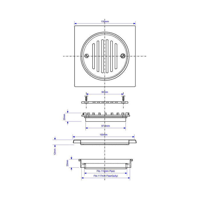 150mm Square Polished Stainless Steel Tile with removable grid and securing screws, and ABS Adaptor