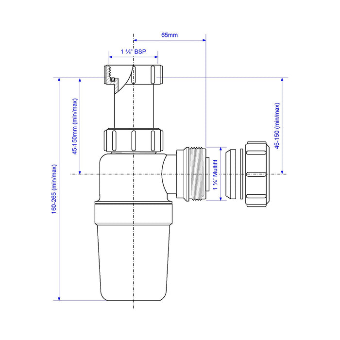 75mm Water Seal Adjustable Inlet Chrome Plated Plastic Bottle Trap with 1¼" Multifit Outlet